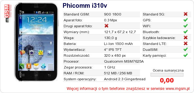 Dane telefonu Phicomm i310v na Twojej stronie
