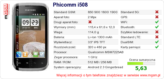 Dane telefonu Phicomm i508 na Twojej stronie