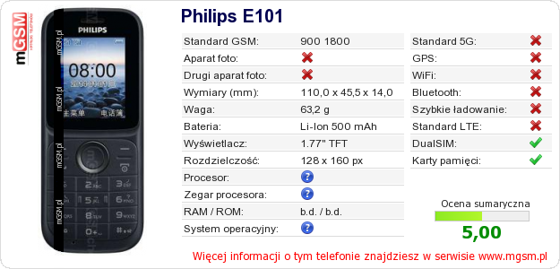 Dane telefonu Philips E101 na Twojej stronie