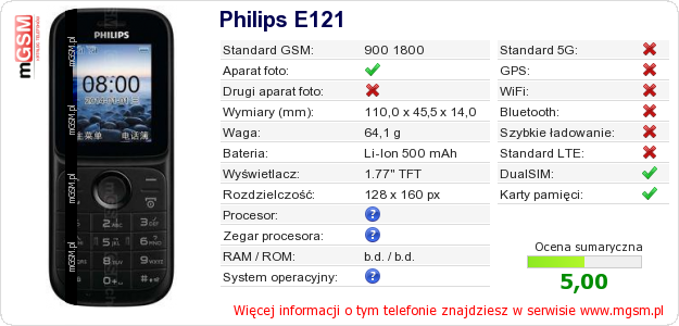 Dane telefonu Philips E121 na Twojej stronie