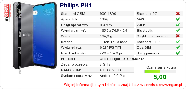 Dane telefonu Philips PH1 na Twojej stronie