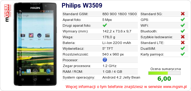 Dane telefonu Philips W3509 na Twojej stronie