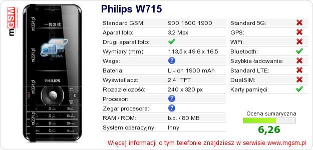 Dane telefonu Philips W715 na Twojej stronie