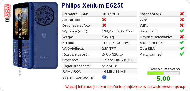 Dane telefonu Philips Xenium E6250 na Twojej stronie
