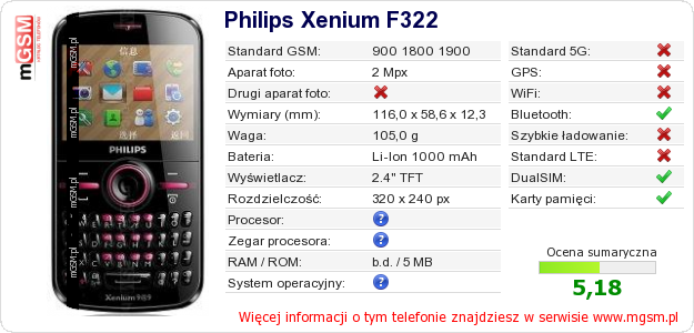 Dane telefonu Philips Xenium F322 na Twojej stronie