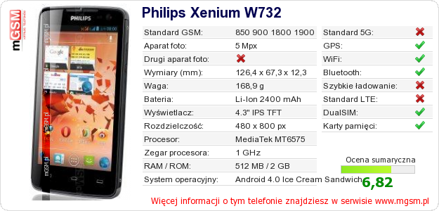Dane telefonu Philips Xenium W732 na Twojej stronie