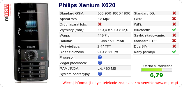 Dane telefonu Philips Xenium X620 na Twojej stronie