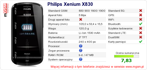 Dane telefonu Philips Xenium X830 na Twojej stronie