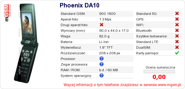 Dane telefonu Phoenix DA10 na Twojej stronie