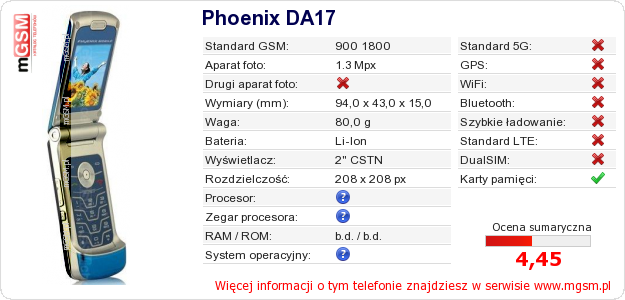 Dane telefonu Phoenix DA17 na Twojej stronie