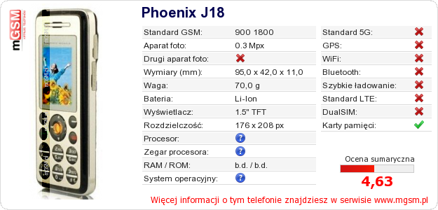 Dane telefonu Phoenix J18 na Twojej stronie