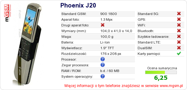 Dane telefonu Phoenix J20 na Twojej stronie
