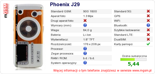 Dane telefonu Phoenix J29 na Twojej stronie