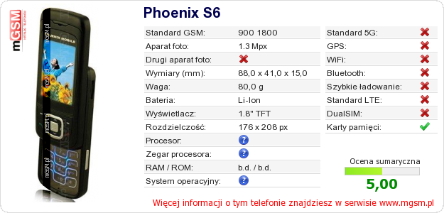 Dane telefonu Phoenix S6 na Twojej stronie