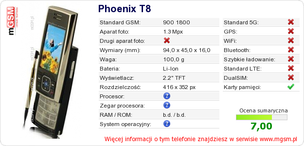 Dane telefonu Phoenix T8 na Twojej stronie