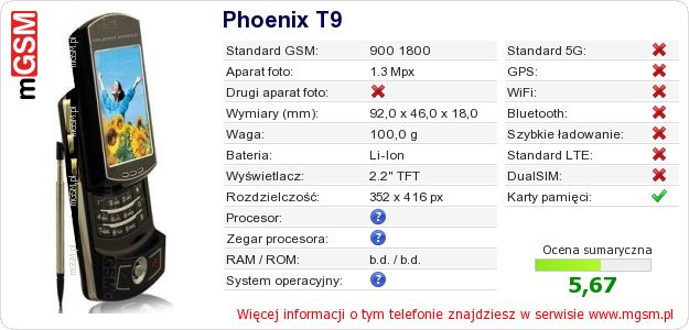 Dane telefonu Phoenix T9 na Twojej stronie