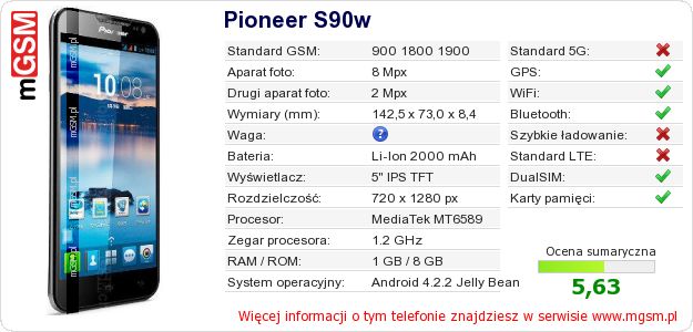 Dane telefonu Pioneer S90w na Twojej stronie