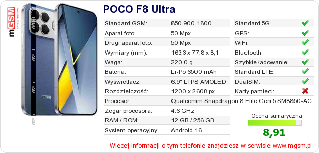 Dane telefonu POCO F8 Ultra na Twojej stronie