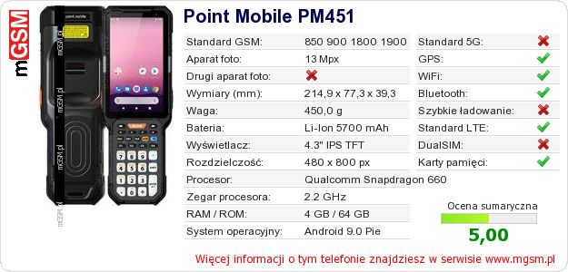 Dane telefonu Point Mobile PM451 na Twojej stronie