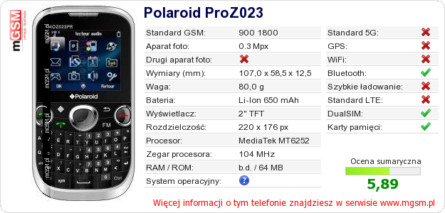 Dane telefonu Polaroid ProZ023 na Twojej stronie