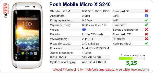 Dane telefonu Posh Mobile Micro X S240 na Twojej stronie