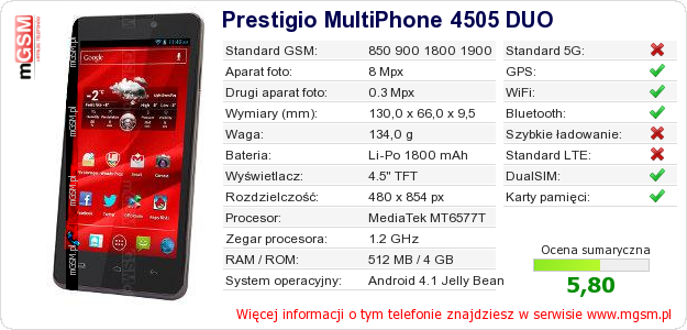 Dane telefonu Prestigio MultiPhone 4505 DUO na Twojej stronie