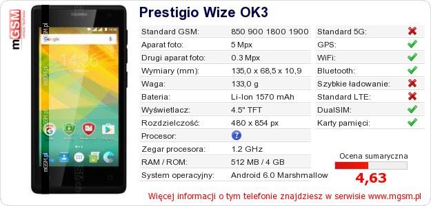 Masz swoją stronę? Chcesz wstawić gdzieś informacje o podstawowych danych telefonu Prestigio Wize OK3 ? To bardzo proste. Możesz pobrać obrazek, lub skopiować i wkleić na stronę poniższy kod:Wklejenie tego kodu spowoduje wyświetlenie poniższego obrazka: