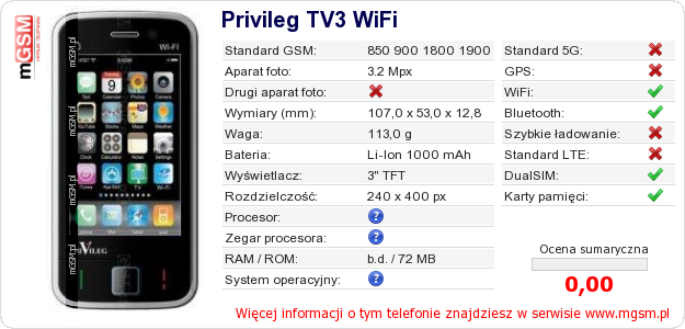 Dane telefonu Privileg TV3 WiFi na Twojej stronie