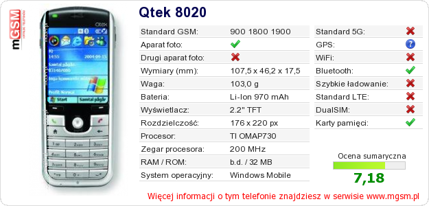 Dane telefonu Qtek 8020 na Twojej stronie