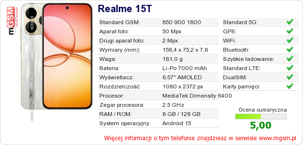 Dane telefonu Realme 15T na Twojej stronie