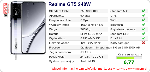 Dane telefonu Realme GT5 240W na Twojej stronie