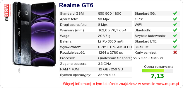 Dane telefonu Realme GT6 na Twojej stronie