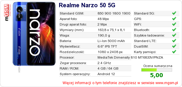 Dane telefonu Realme Narzo 50 5G na Twojej stronie