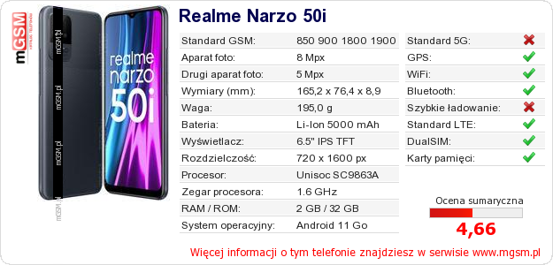Dane telefonu Realme Narzo 50i na Twojej stronie
