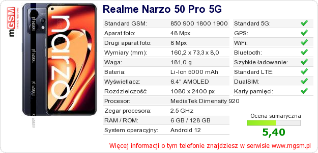 Dane telefonu Realme Narzo 50 Pro 5G na Twojej stronie