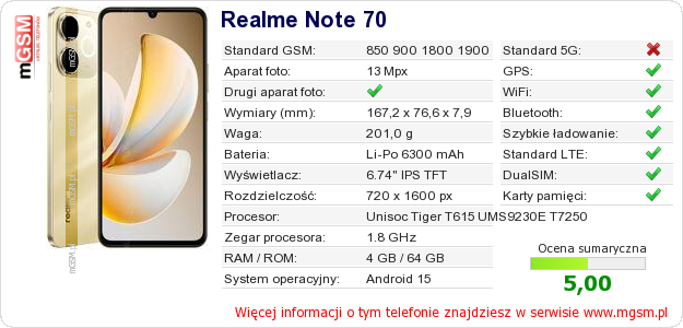 Dane telefonu Realme Note 70 na Twojej stronie