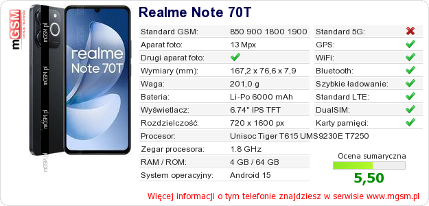 Dane telefonu Realme Note 70T na Twojej stronie