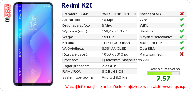 Dane telefonu Redmi K20 na Twojej stronie