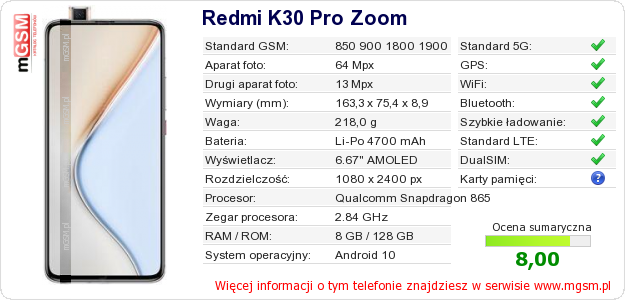 Dane telefonu Redmi K30 Pro Zoom na Twojej stronie
