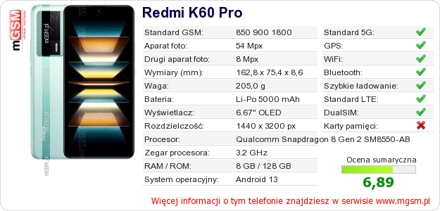 Dane telefonu Redmi K60 Pro na Twojej stronie