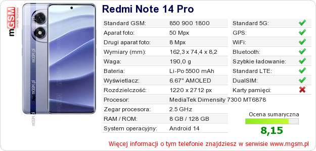 Dane telefonu Redmi Note 14 Pro na Twojej stronie