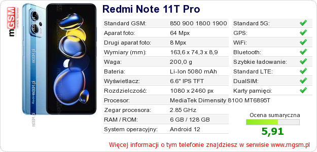Dane telefonu Redmi Note 11T Pro na Twojej stronie