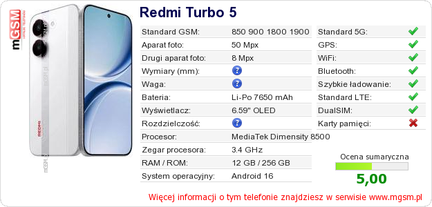 Dane telefonu Redmi Turbo 5 na Twojej stronie