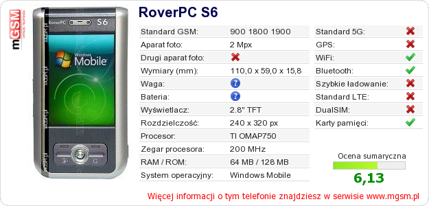 Dane telefonu RoverPC S6 na Twojej stronie