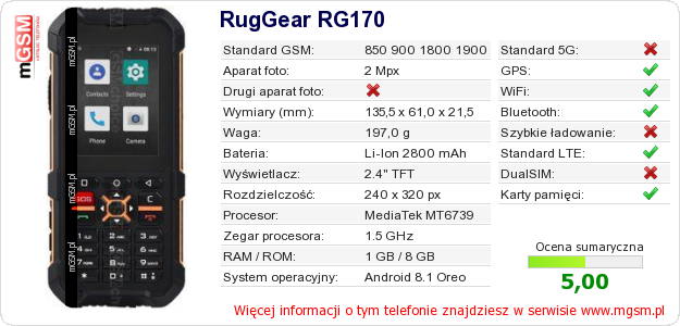 Dane telefonu RugGear RG170 na Twojej stronie
