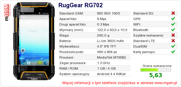 Dane telefonu RugGear RG702 na Twojej stronie