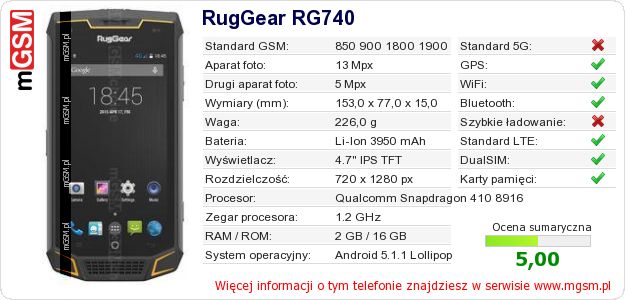 Dane telefonu RugGear RG740 na Twojej stronie