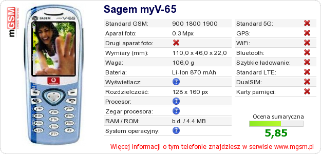 Dane telefonu Sagem myV-65 na Twojej stronie