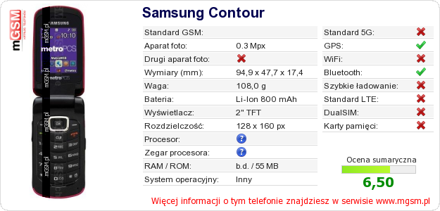 Masz swoją stronę? Chcesz wstawić gdzieś informacje o podstawowych danych telefonu Samsung Contour ? To bardzo proste. Możesz pobrać obrazek, lub skopiować i wkleić na stronę poniższy kod:Wklejenie tego kodu spowoduje wyświetlenie poniższego obrazka:
