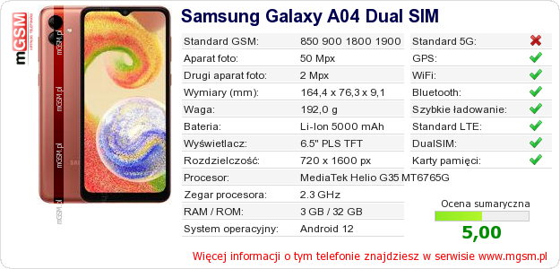 Dane telefonu Samsung Galaxy A04 Dual SIM na Twojej stronie
